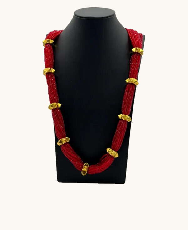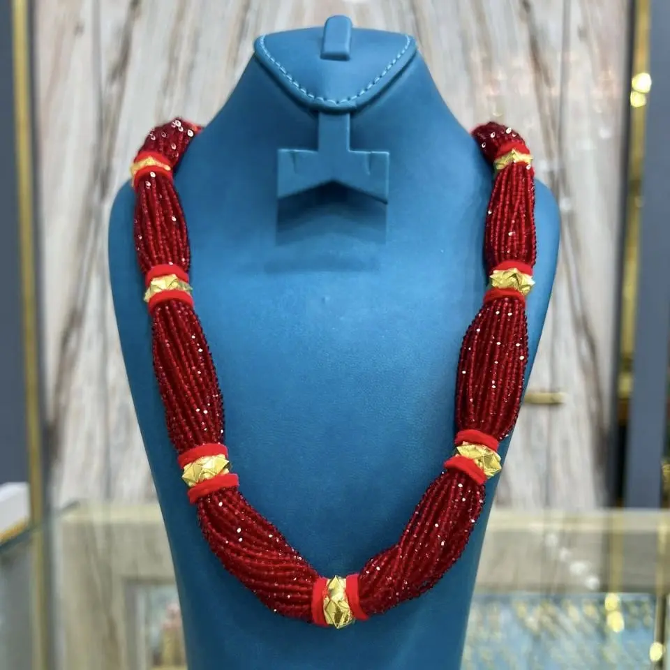 A radiant symbol of feminine strength and ancestral elegance, the Naudegi is a classic Nepali ornament worn across generations. Featuring nine delicately sculpted gold-plated discs—each representing the Nau Devi, or nine goddesses—this piece honors divine energy, protection, and tradition. The discs are often embellished with subtle motifs or hand-etched textures, linked together in a graceful, flowing design.