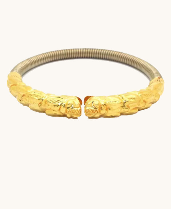 Inspired by the five sacred jewels—Pancha Ratna—this traditional bangle reflects the harmony of spiritual strength, beauty, and protection. Crafted in a timeless circular form, the bangle is adorned with five raised, gem-inspired motifs that symbolize wisdom, compassion, power, peace, and purity. Finished in a radiant 24k gold plating, its detailed craftsmanship speaks to the depth of Nepali heritage and artisanal skill.