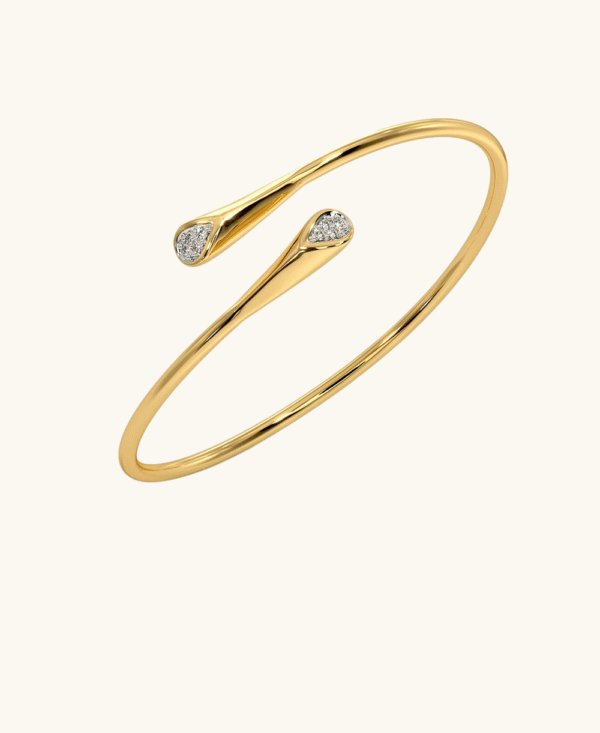 This sleek 22 karat gold bangle wraps gracefully around the wrist with its open-ended design, finished with subtle teardrop diamond accents. A perfect balance of minimalism and modern elegance for everyday sophistication.