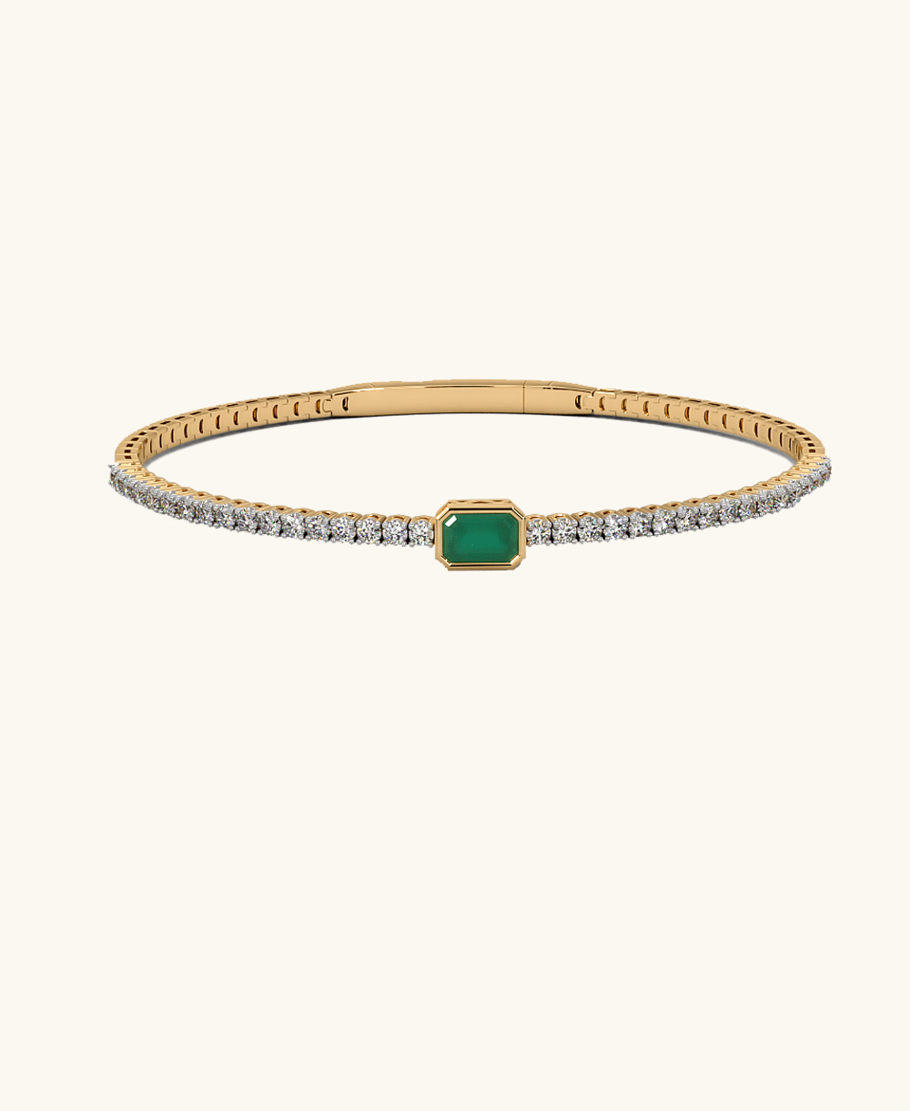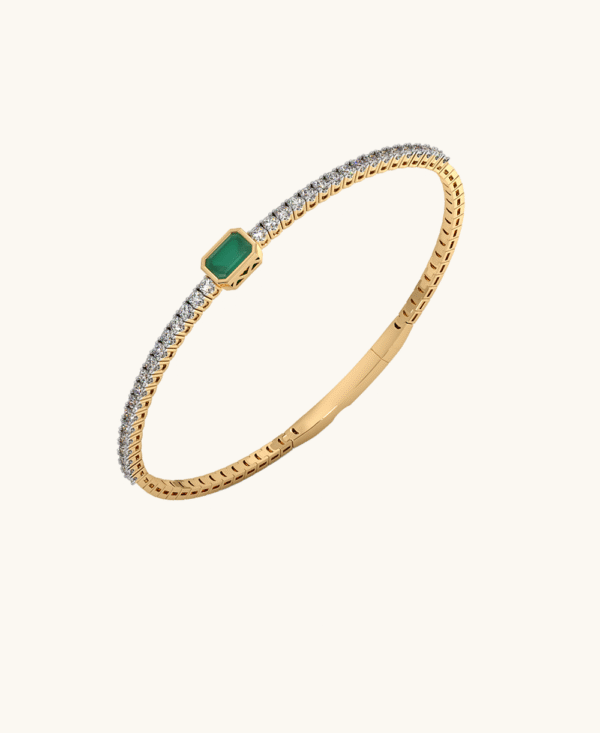 A bold whisper of color meets refined brilliance in this 22 karat gold bangle, featuring a vivid emerald-cut green centerpiece set among a trail of luminous diamonds. An effortless blend of classic luxury and modern allure.