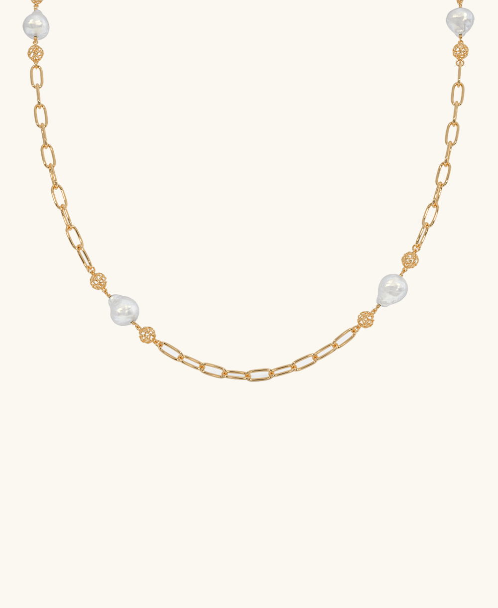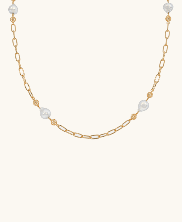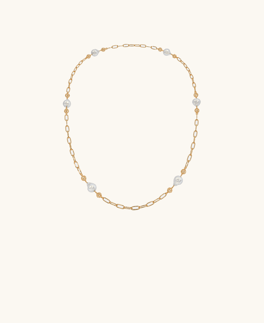 A harmonious blend of tradition and modernity, this 22 karat gold necklace features textured links punctuated with luminous pearl-like accents. Effortlessly elegant, it’s perfect for both festive and everyday charm.